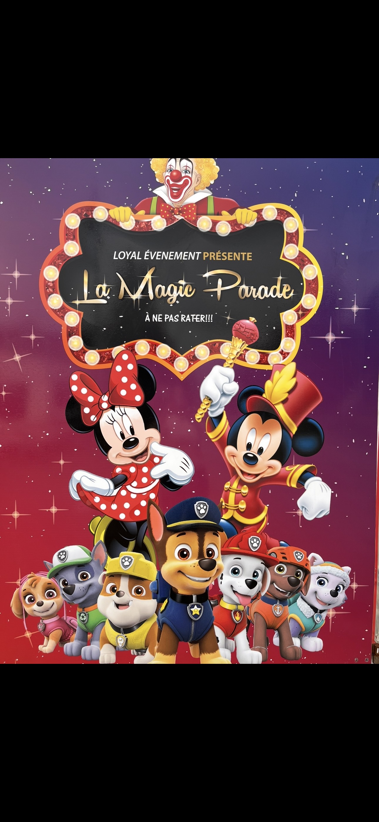 Retrouvez dans ce spectacle des personnages interprétés : Mickey, Minnie, Marcus et Stella de la Pat’ Patrouille, un clown, un jongleur, un équilibriste, un contorsionniste !
